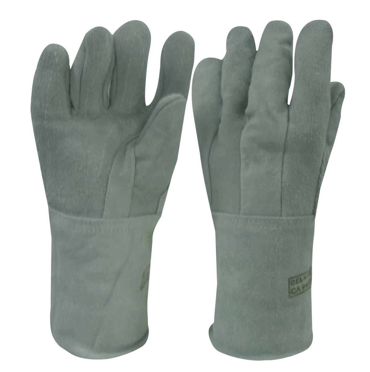 Luva de segurança de cinco dedos confeccionada em couro bovino tipo raspa, com reforço interno nos dedos e palma e reforço externo entre os dedos polegar e indicador.